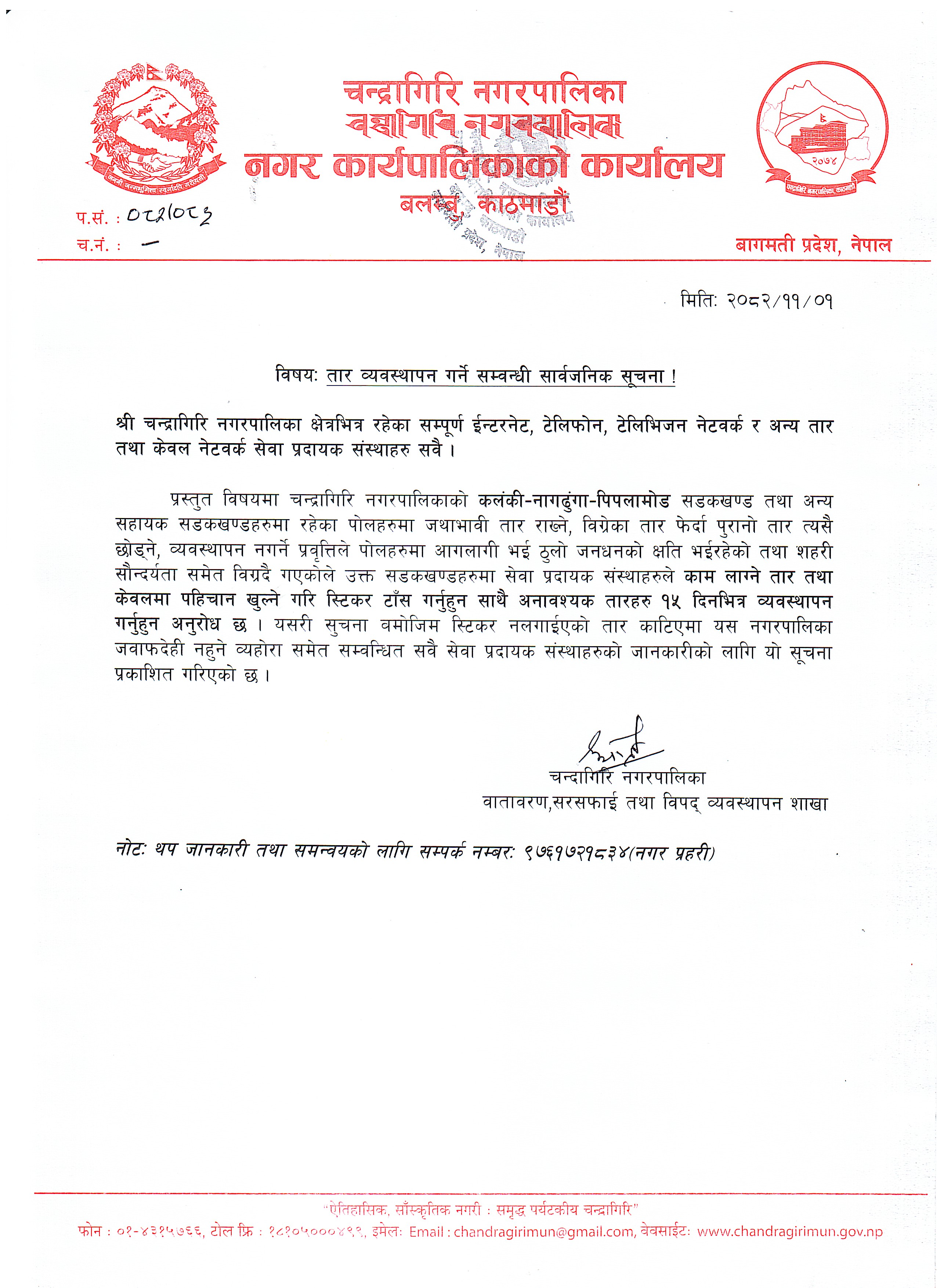 अव्यवस्थित तार व्यवस्थापन गर्ने सम्वन्धी सार्वजनिक सूचना |