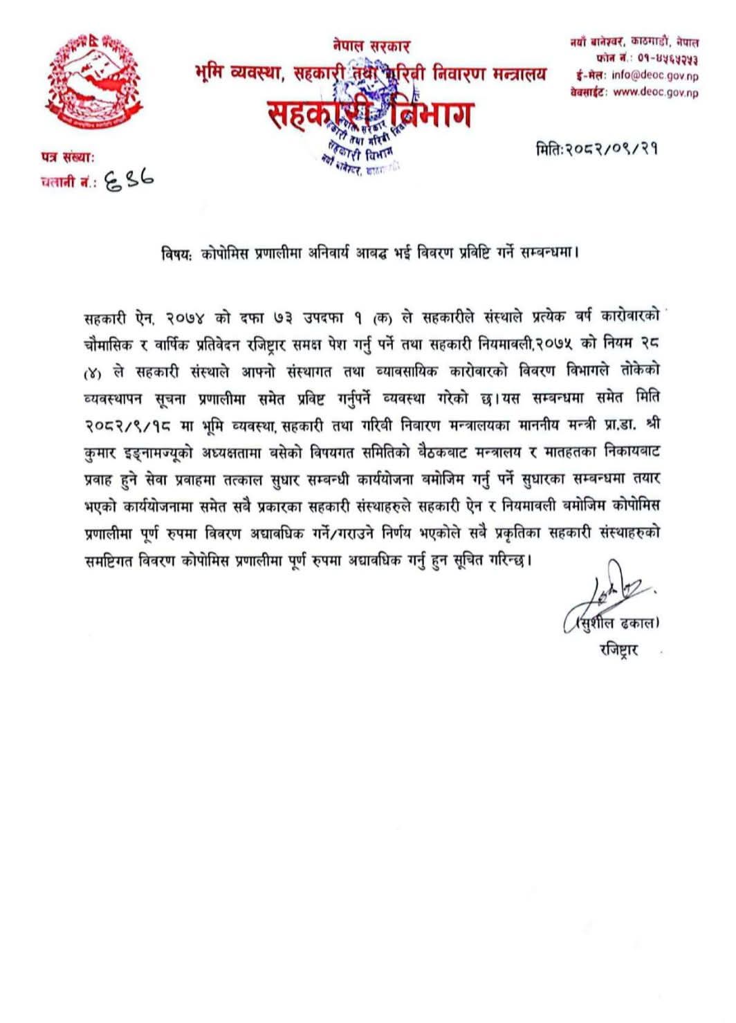 कोपोमिस प्रणालीमा अनिवार्य आवद्द भइ विवरण प्रविष्टि गर्ने सम्वन्धी सहकारी विभागको सूचना |