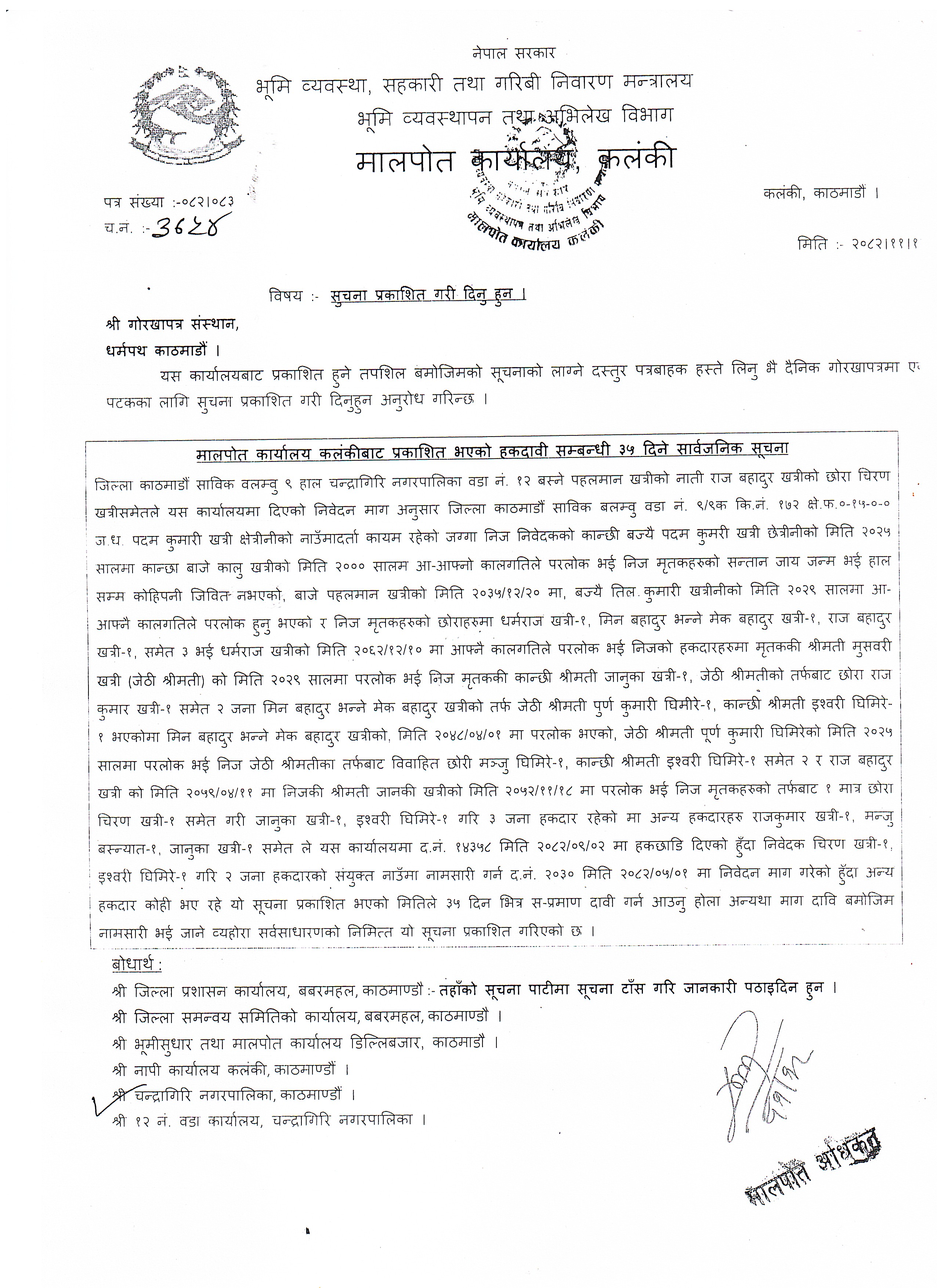 मालपोत कार्यालय कलंकीबाट प्रकाशित भएको हकदावी सम्वन्धी ३५ दिने सूचना |