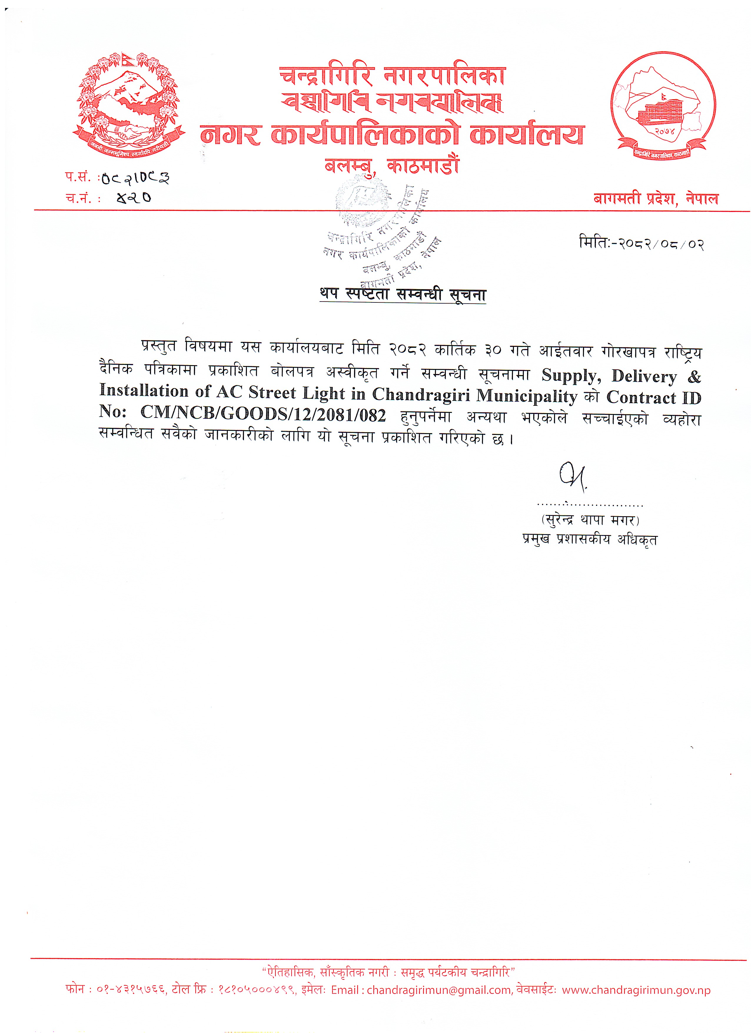 मिति २०८२/०७/३० गते गोरखापत्र राष्ट्रिय दैनिक पत्रिकामा प्रकाशित बोलपत्र अस्वीकृत गर्ने सम्वन्धी सूचनाको सम्वन्धमा गरिएको थप स्पस्टता सम्वन्धमा |