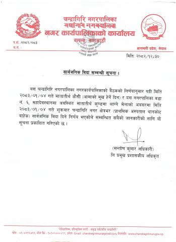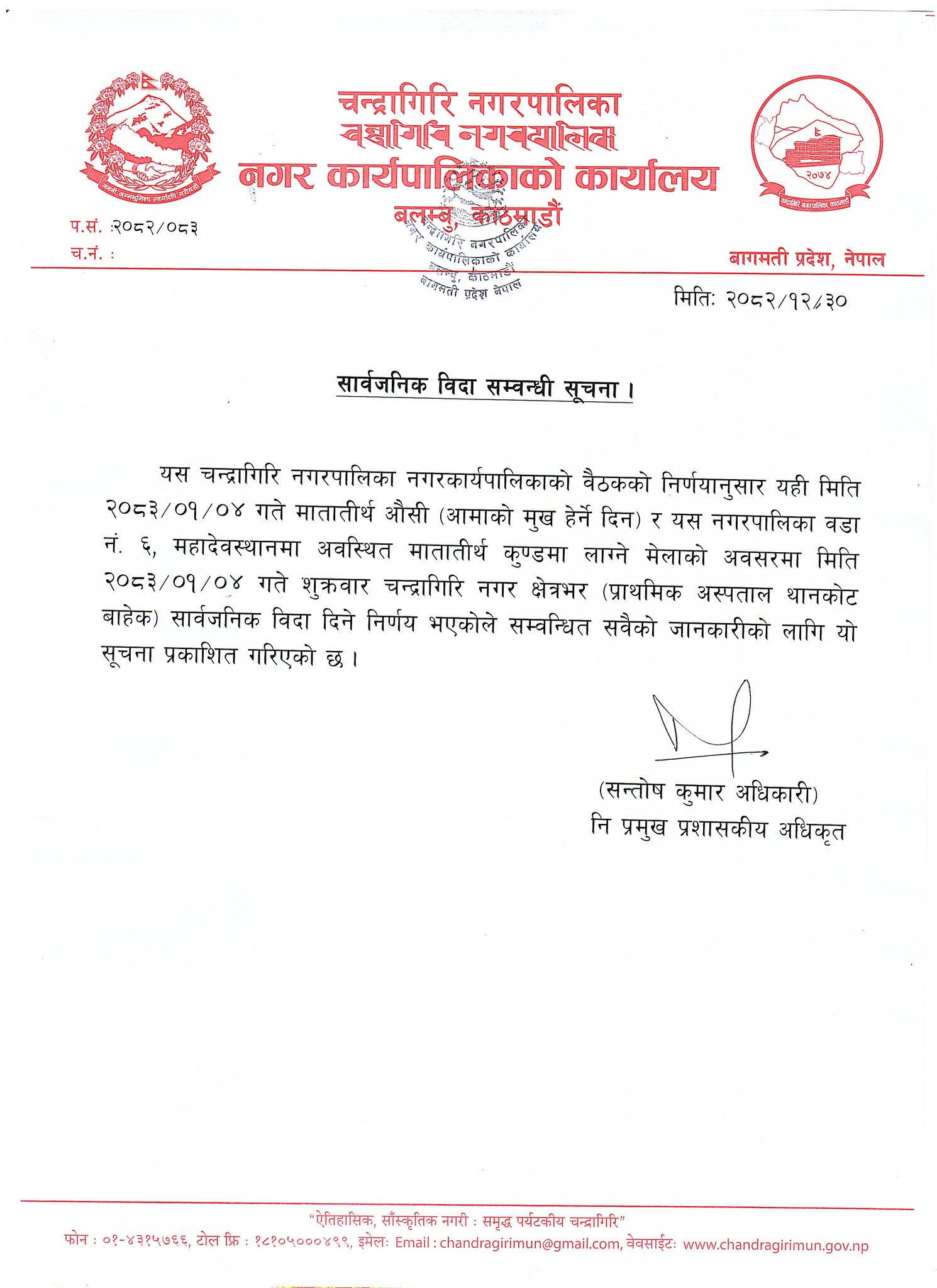 मिति २०८३/१/४ गते मातातिर्थ औसी(आमाको मुख हेर्ने दिन) मातातिर्थ कुण्डमा लाग्ने मेलाको अवसरमा सार्वजनिक विदा दिने सम्वन्धी सूचना |
