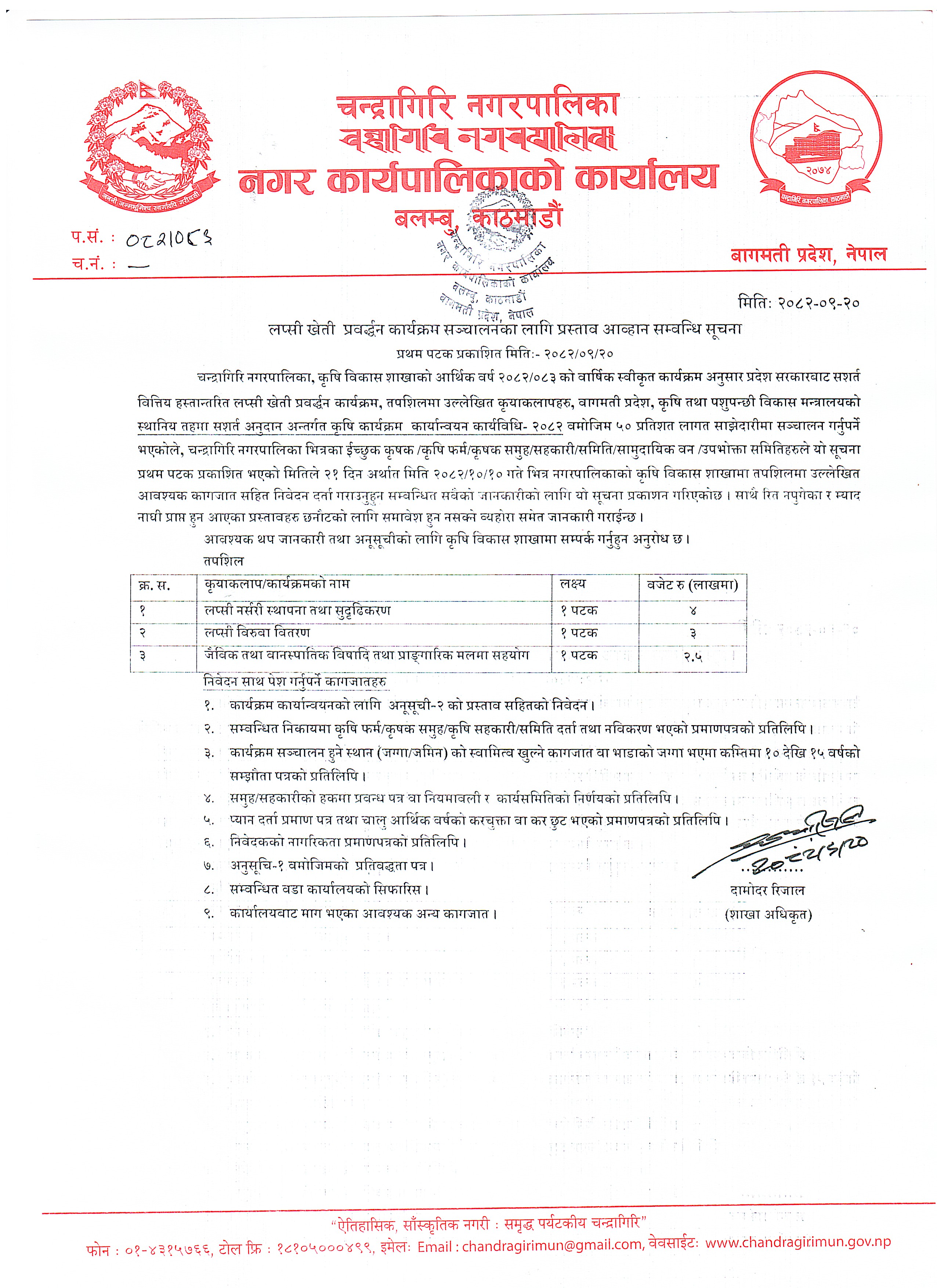 लप्सी खेति प्रवर्द्धन कार्यक्रम संचालनका लागि प्रस्ताव आह्वान सम्वन्धी सूचना |
