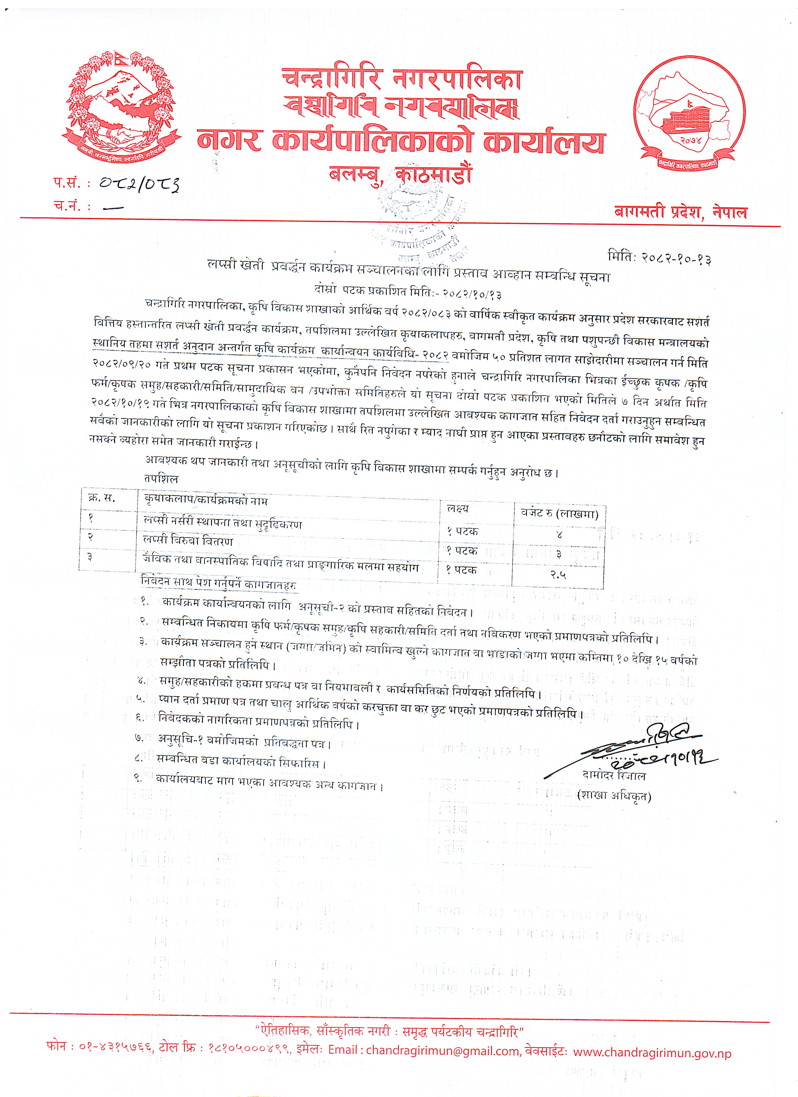 » लप्सी खेती प्रवर्द्धन कार्यक्रम संचालनका लागि प्रस्ताव आह्वान सम्वन्धी सूचना |