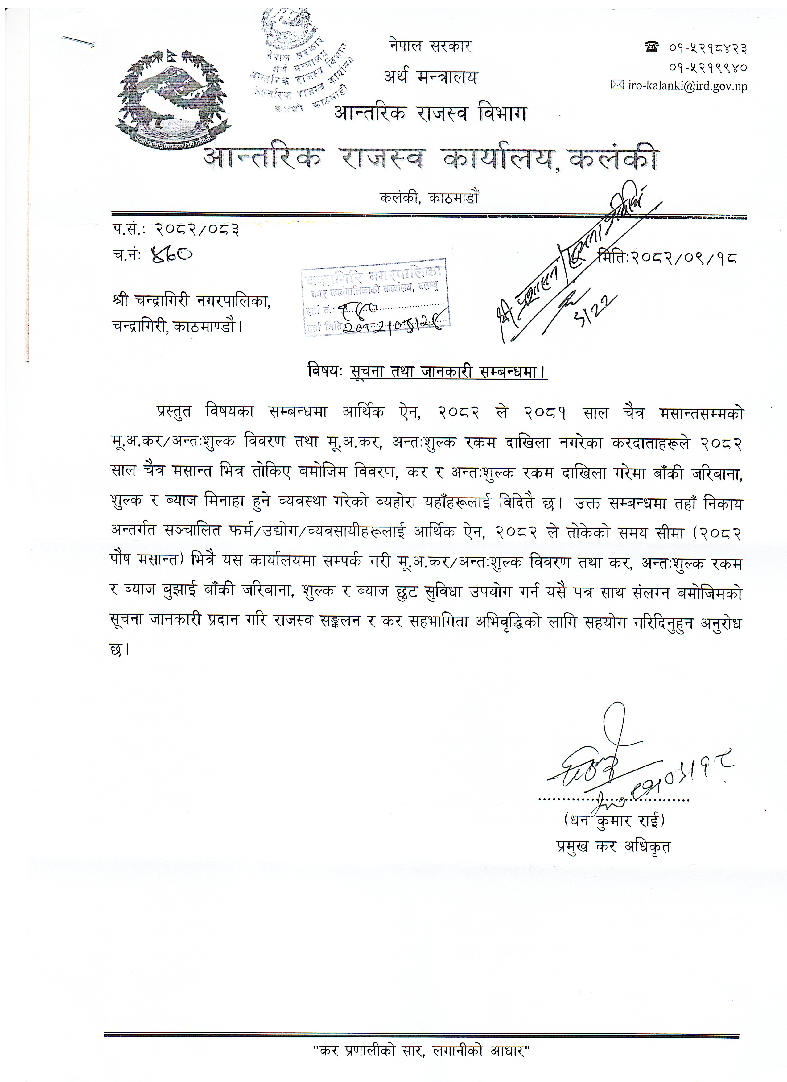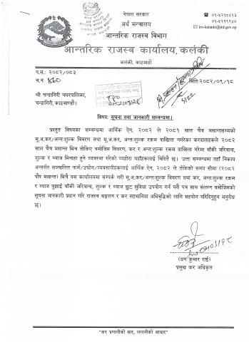 कर छुट सम्वन्धी आन्तरिक राजस्व कार्यालय, कलंकीको सूचना |