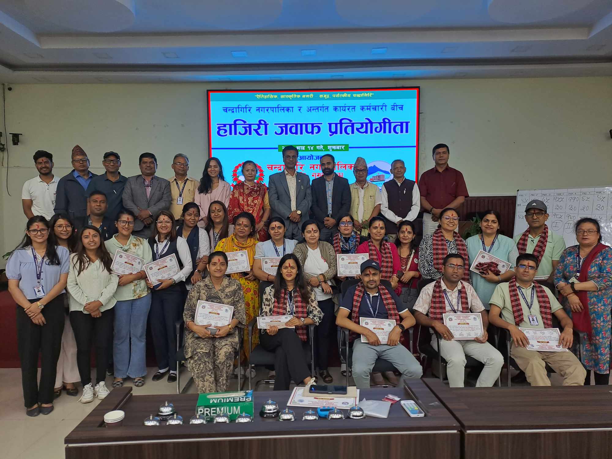 मिति २०८१ भाद्र १४ गतेका दिन चन्द्रागिरि नगरपालिकाको सभाहलमा नगरपालिका कार्यालय र अन्तर्गतका कार्यालयहरुमा कार्यरत कर्मचारीहरुको हाजिरीजवाफ प्रतियोगिता सम्पन्न भएको छ | प्रतियोगिता सहभागीहरुमध्येबाट गोलाप्रथा मार्फत समुह विभाजन गरि जम्मा १० वटा समुह कायम भएका थिए | कुल ४ वटा विधाहरु जनरल राउण्ड, अडियो भिजुअल राउण्ड, बजर राउण्ड, र्यापिड फायर राउण्ड गरि प्रश्नहरु सोधिएको थियो | प्रतियोगितामा यशोदा रायमाझीले नेतृत्व गर्नुभएको समूह पहिलो स्थान, रविन पोखरेलले नेतृत्व गर्नुभएको समूह दोस्रो स्थान र विश्वबन्धु विनयीले नेतृत्व गर्नुभएको समूह तेस्रो स्थान हासिल गर्न सफल हुनुभएको थियो | कार्यक्रममा नगर प्रमुखज्यू , उप प्रमुखज्यू, नगर प्रवक्ताज्यू, प्रमुख प्रशासकीय अधिकृतज्यू, नगर कार्यपालिका सदस्यज्यूहरु नगर सभा सदस्यज्यूहरु, कर्मचारीहरुको उपस्थिति रहेको थियो |