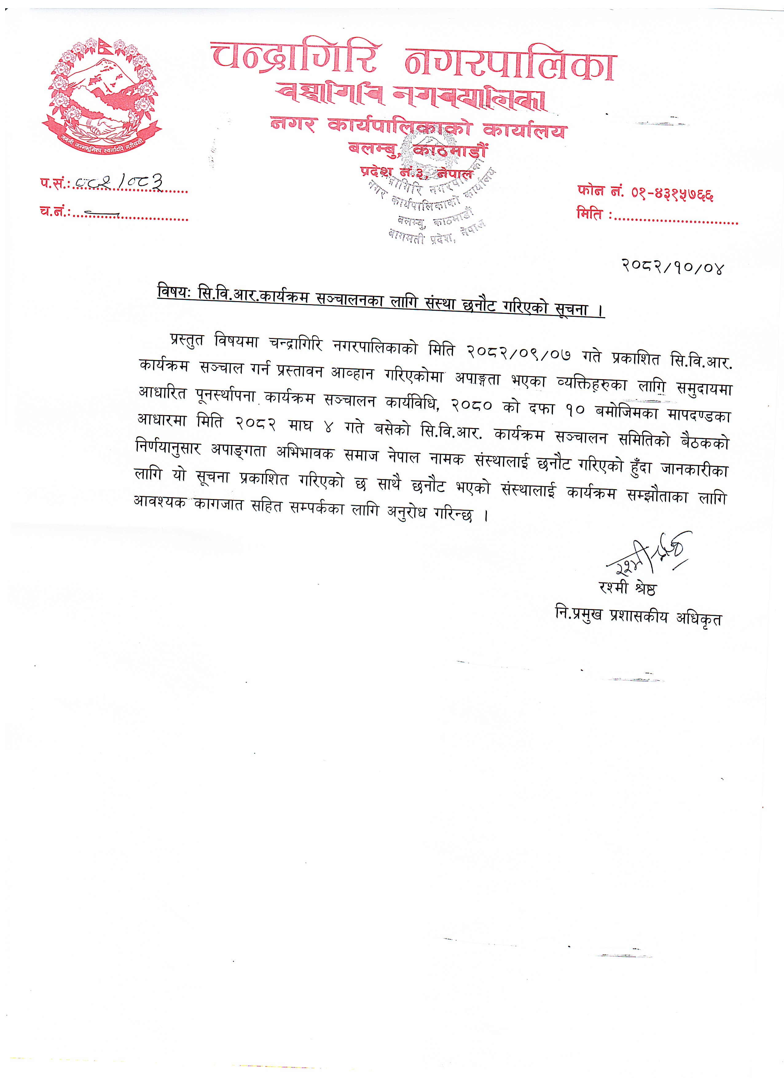सि.वि.आर कार्यक्रम संचालनका लागि संस्था छनौट गरिएको सूचना |