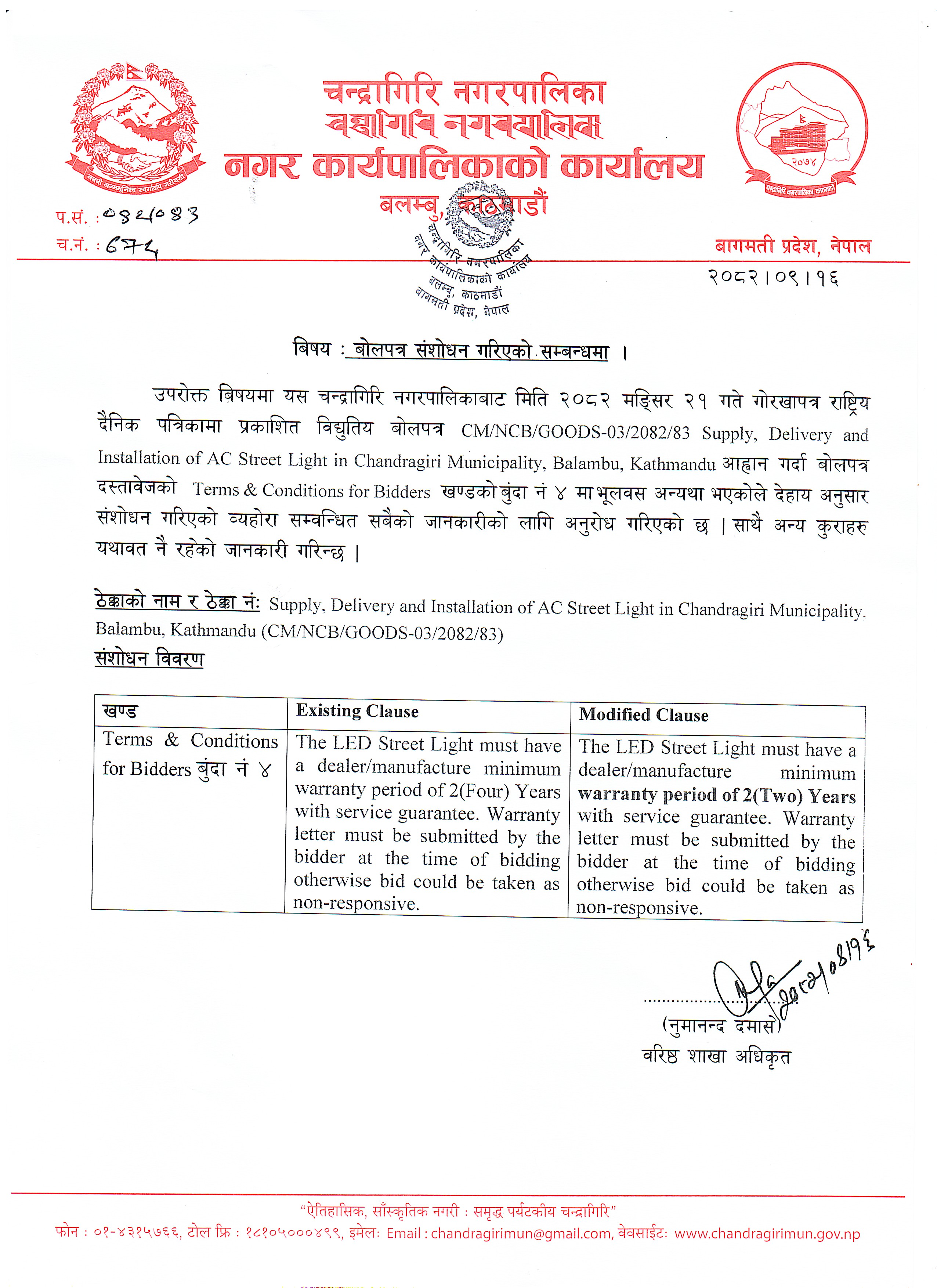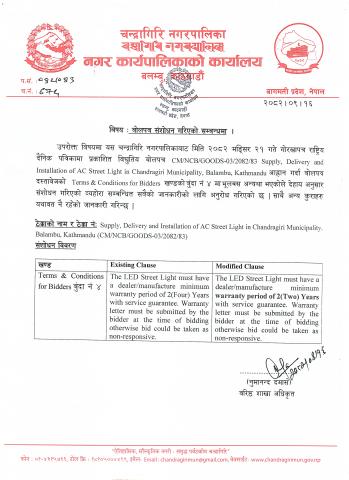 बोलपत्र संशोधन गरिएको सम्बन्धमा (CM/NCB/GOODS-03/2082/83)
